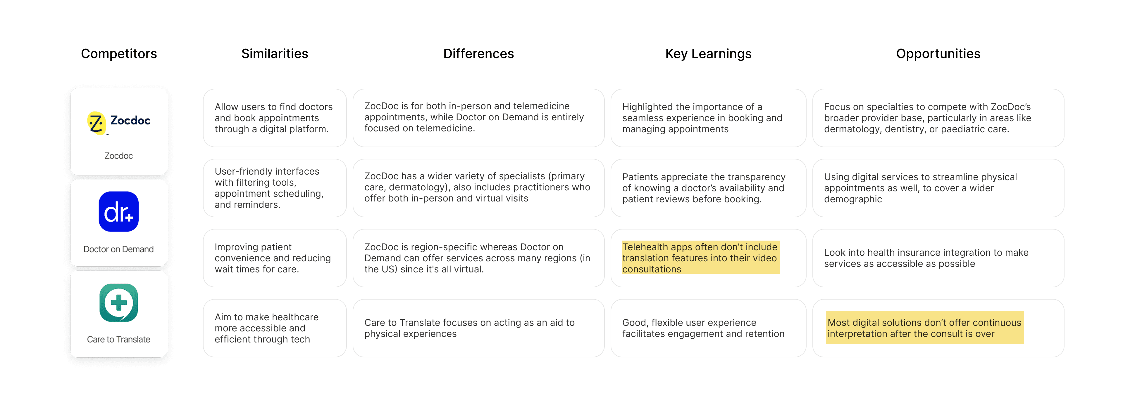 We used competitive analysis to compared pre-existing solutions and discover opportunities. Expert interviews helped us uncover user pain points and better understand the lens of healthcare practitioners.