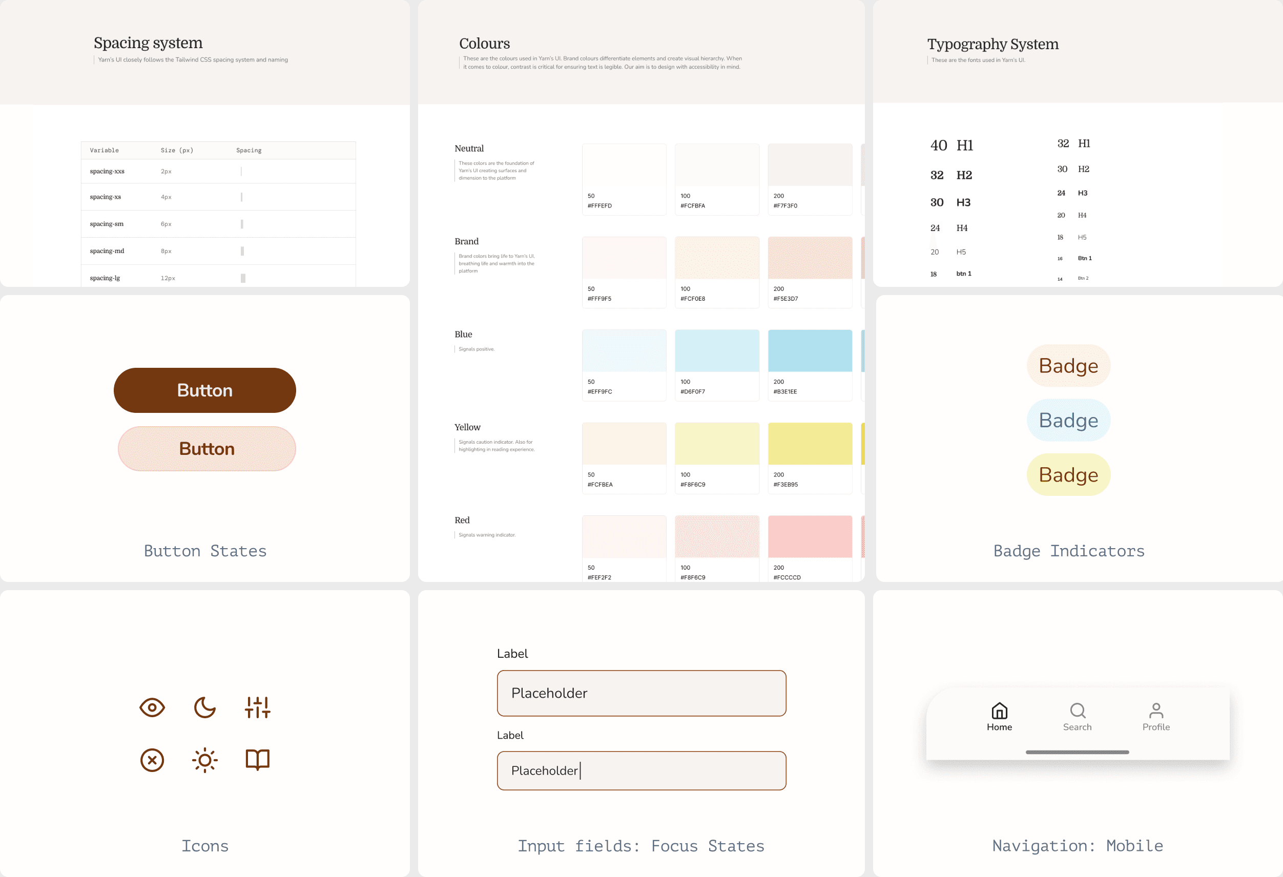 Colour, Typography, and Spacing system using primitives/semantic variables to be extended and systematized for the rest of the screens.